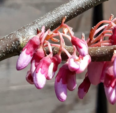 Flowers: Small pea-like blossoms borne directly on bare wood and branches (cauliflorous) in early spring, usually pink to magenta (some varieties pale pink or white). Flowers often appear before the leaves.