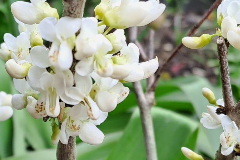 Fruit: Flat legume pods appear after flowering; can be left or removed depending on aesthetic preference.